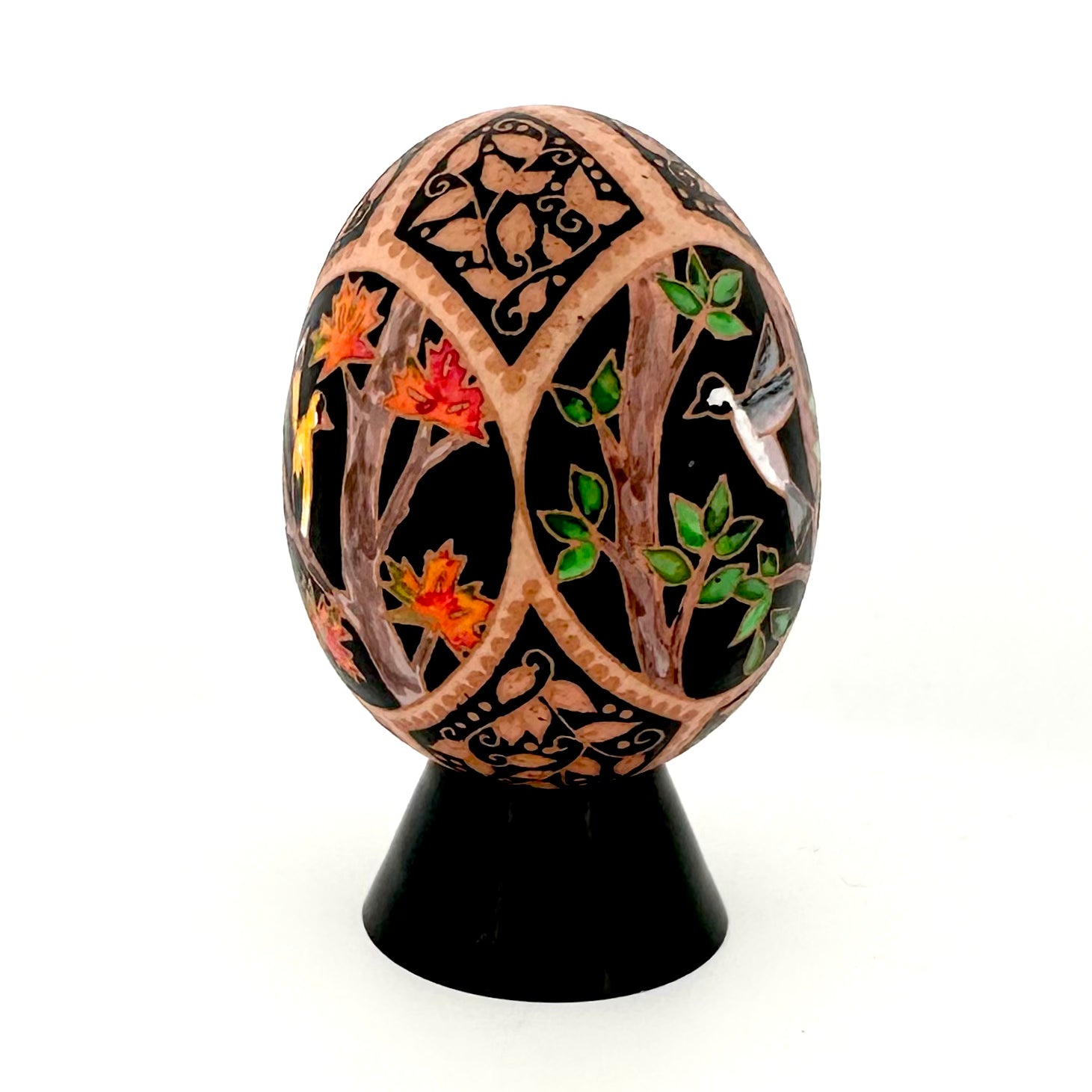 This handmade pysanka can last decades with simple proper care. Always store and display out of direct sunlight to prevent fading. Avoid water and dropping.