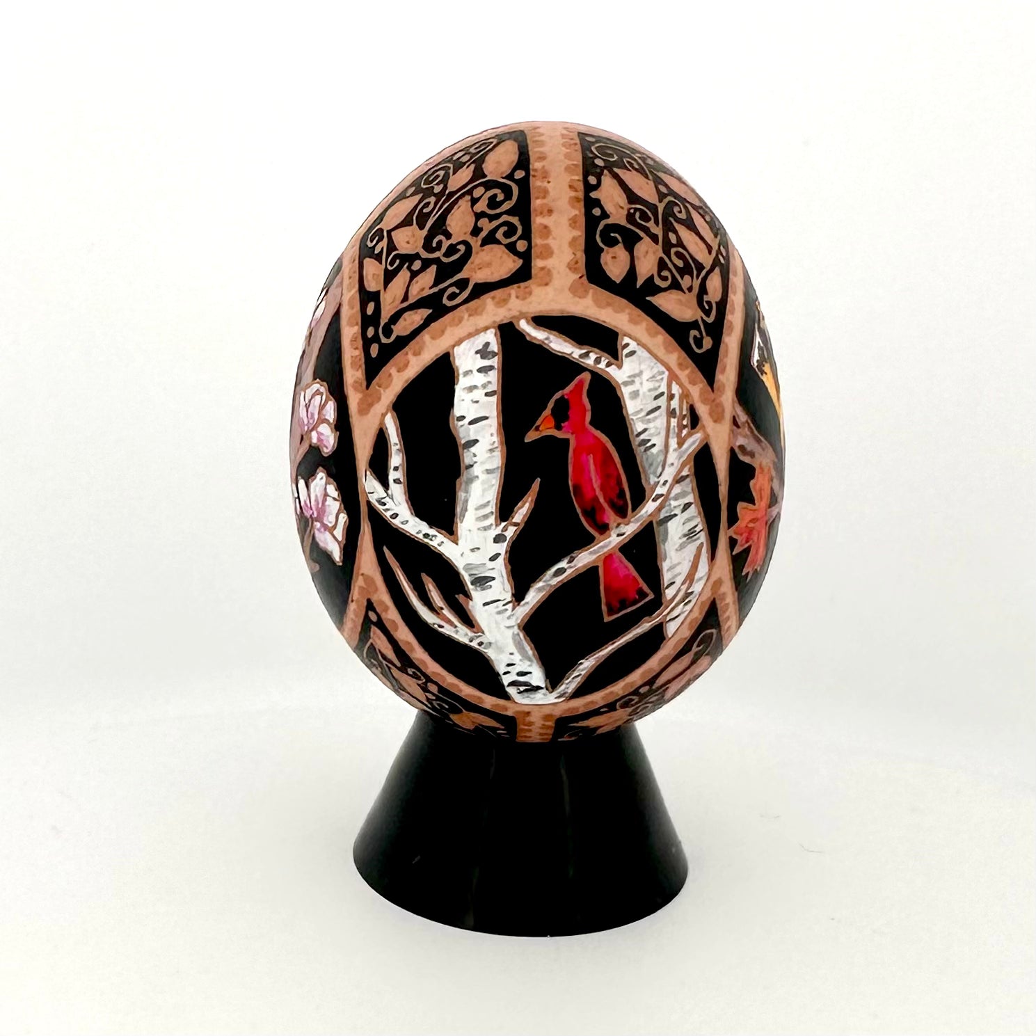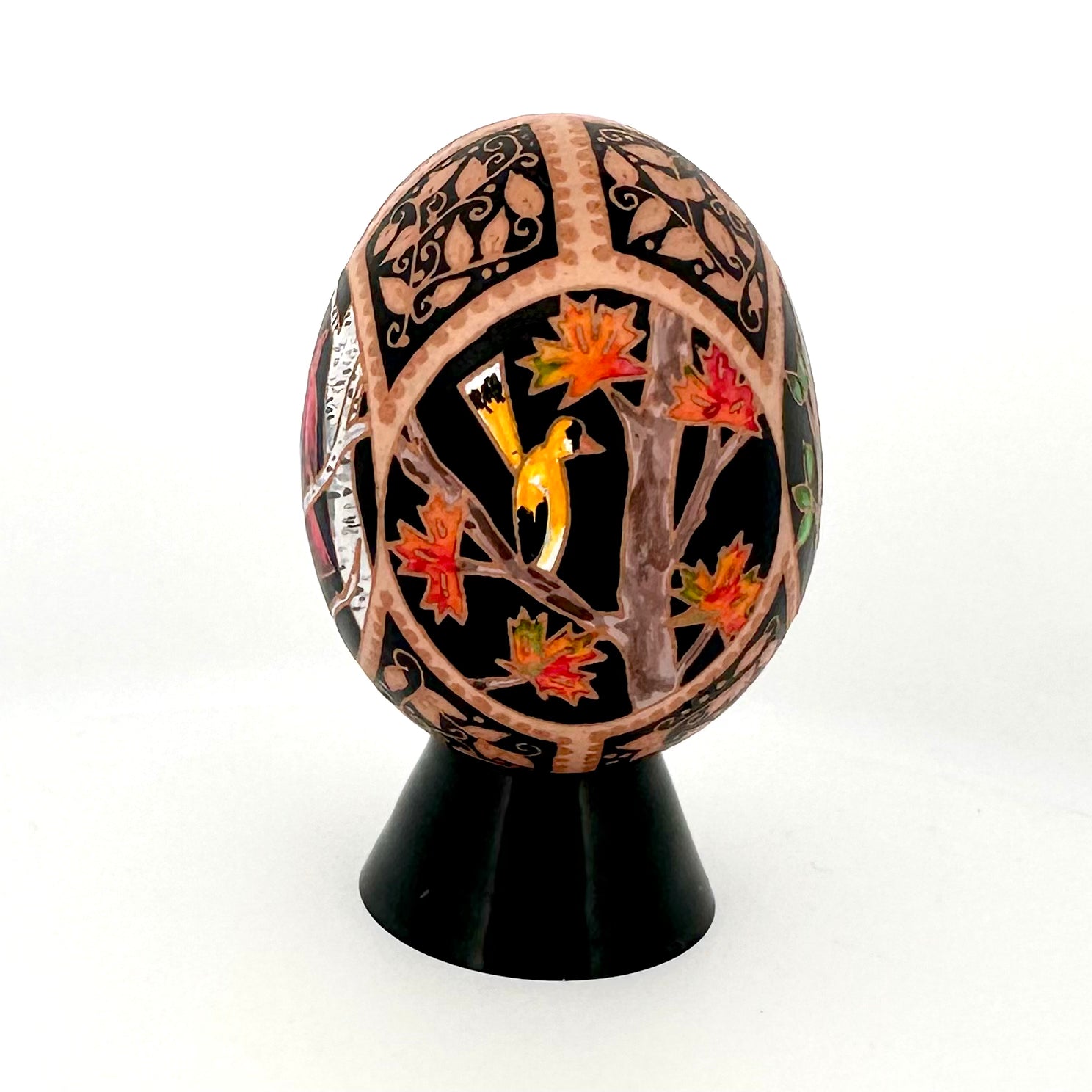 This work by artist Katherine Alexander is a one of a kind Pysanky chicken egg. This Pysanka was created in the traditional folk method with wax and dye. It has been drained and finished with a UV protective varnish but should be displayed out of direct sunlight to prevent fading. A small black lucite stand is included. Pysanky is breakable and should have a location chosen with care to prevent falls.