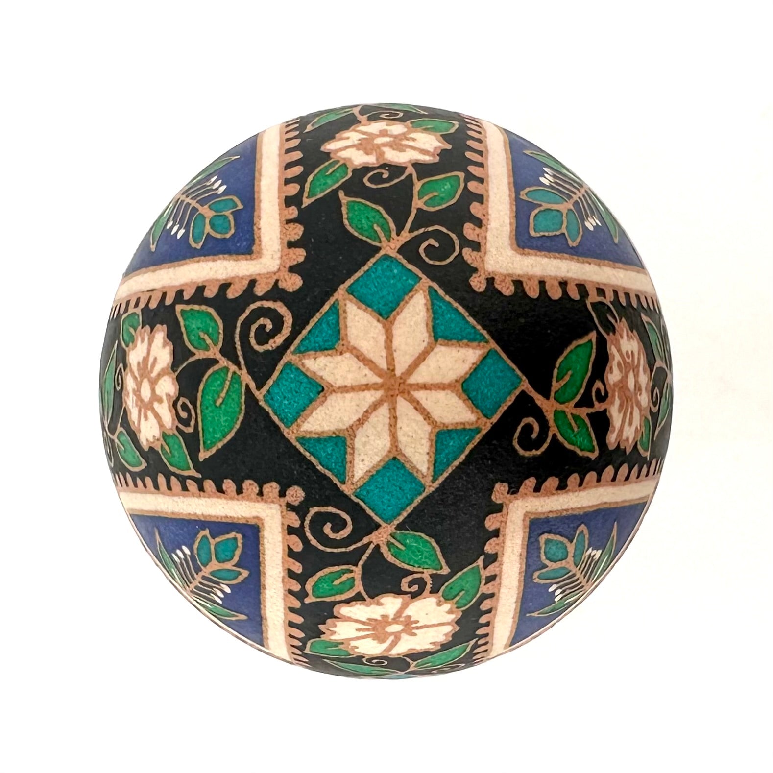 This work by artist Katherine Alexander is a one of a kind Pysanky chicken egg. This Pysanka was created in the traditional folk method with wax and dye. It has been drained and finished with a UV protective varnish but should be displayed out of direct sunlight to prevent fading. A small black lucite stand is included. Pysanky is breakable and should have a location chosen with care to prevent falls.
